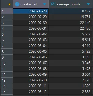 상황: 이번에는 이용자들이 잘 활동하고 있는지 보고자 합니다. 포인트가 많을수록 활동을 잘하고 있다고 생각 할 수 있습니다. 날짜별로 획득한 포인트가 점점 늘어나는지 줄어드는지 확인해 봅시다.