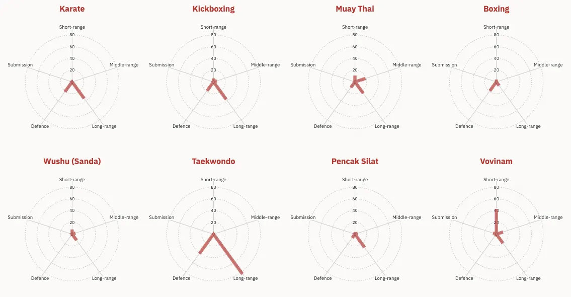 (이 사례는 위에서 소개한 차트 말고도 다양한 방식으로 동양 무술의 특징을 표현하고 있어 흥미로웠어요. 직접 출처 링크에 접속해 콘텐츠를 읽어 보시기를 추천 드립니다!)