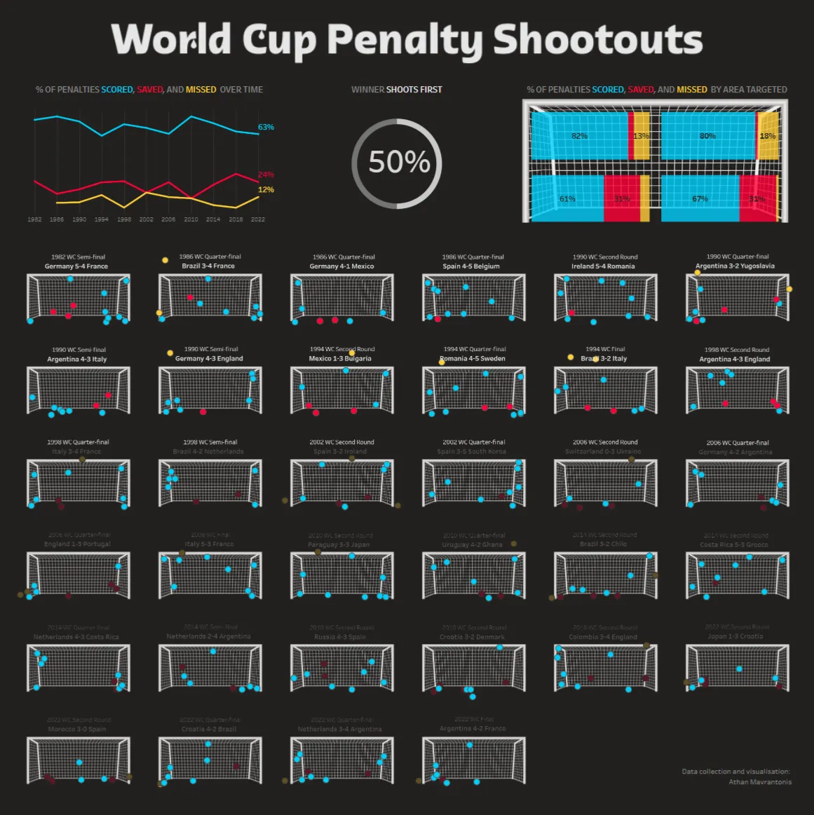 첫 번째로 소개 드릴 사례는 태블로 퍼블릭(Tableau public)의 Athan Mavrantonis가 제작한 '월드컵 승부차기(World Cup Penalty Shootouts)' 대시보드입니다.