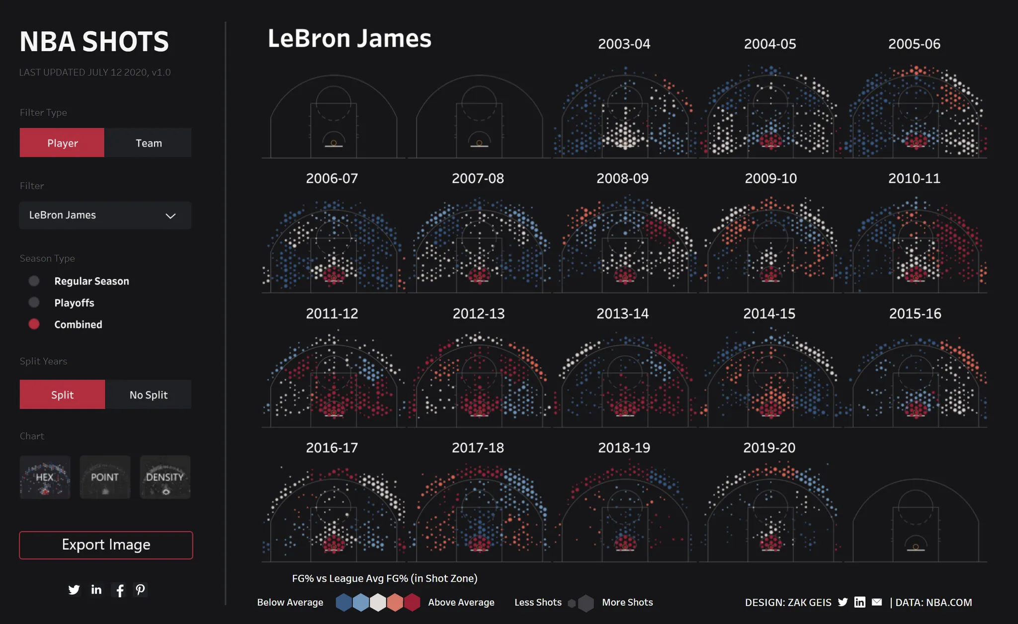 이 대시보드는 NBA 리그에 출전한 농구 선수, 농구 팀별로 슈팅 위치와 성공률 등의 데이터를 시각화한 것입니다. 왼쪽의 필터로 원하는 선수나 팀을 선택해 시각화 결과를 조회할 수 있는데요! 위 사진에서는 유명한 프로 농구 선수인 '르브론 제임스(Lebron James)'를 선택해 보았어요. 조금 더 자세히 살펴볼까요?