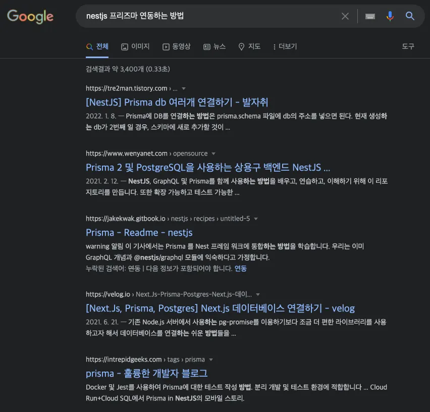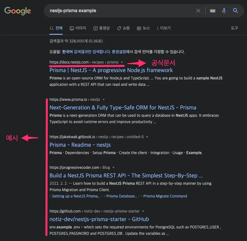 ex) nest.js 프리즈마 연동(x) → nest.js prisma example(o)