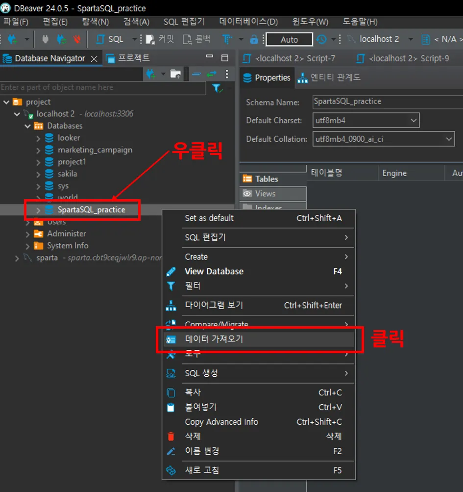 만들어진 DB를 우클릭해서 데이터 가져오기 버튼을 클릭합니다.
