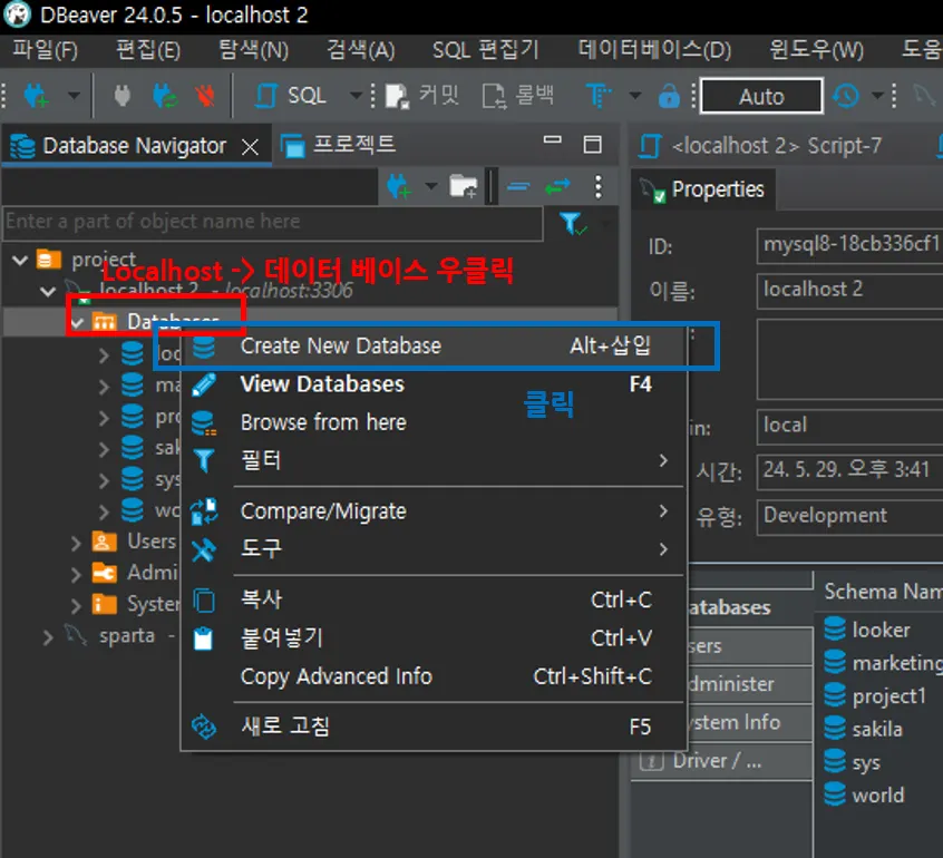 로컬호스트에서 Database를 우클릭 한 뒤 Create New Database를 클릭합니다.