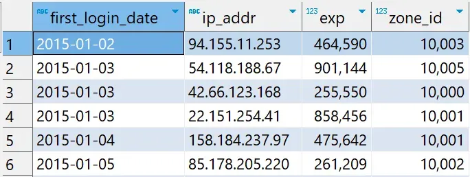 WHERE first_login_date > ‘2023-01-01’; | SELECT first_login_date, ip_addr, exp, zone_id