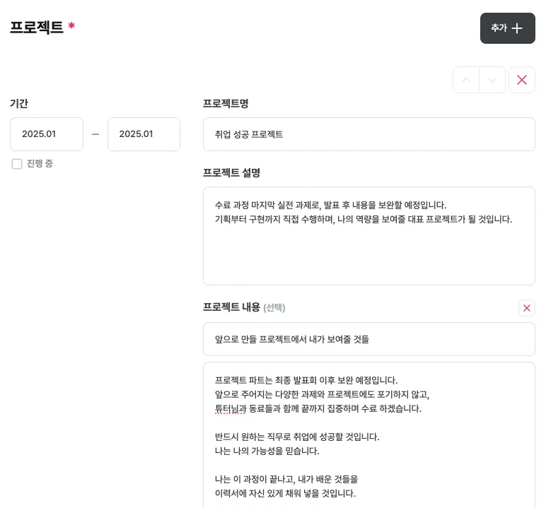 이력서의 프로젝트 파트는 필수 항목입니다. 따라서 저장하기 전에 항목을 채워야해요 !