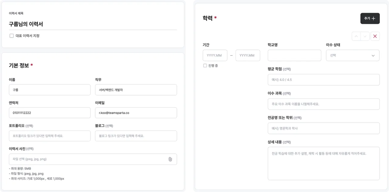 스파르타 커리어 이력서의 [기본 정보], [학력] 파트 완성하기