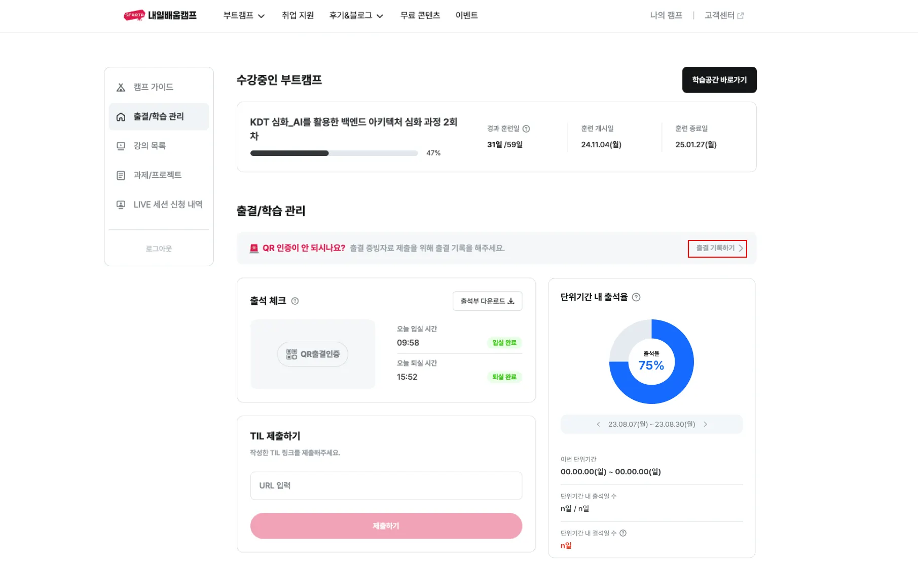 출결 관리 페이지 접속 : https://nbcamp.spartacodingclub.kr/mypage/attendance/qr