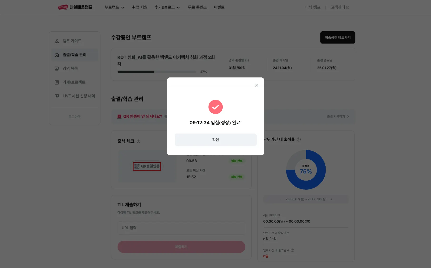 당일 오후 11시 59분까지 퇴실 처리를 하지 않으면 결석 처리됩니다.