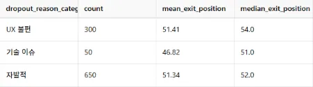 자발적으로 이탈한 사람들이 가장 많음 > 평균 51페이지 정도에서 이탈함 ⇒ 사용자 경험이나 책이 지루해 이탈 하는 경우가 있을 수 있다
