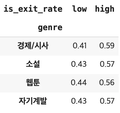경제/시사 장르를 읽는 사람들의 이탈률이 높을 것이다. 승인님