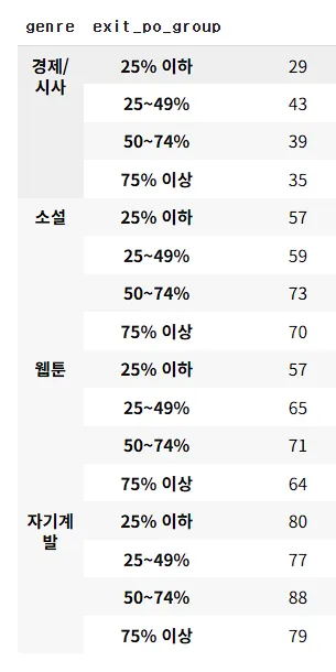 df_merged.groupby(['genre','exit_po_group']).count() ##인원수