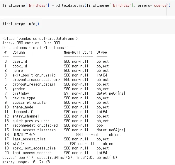 연령 및 연령대 도출을 위한 birthday 데이터 타입 변환
