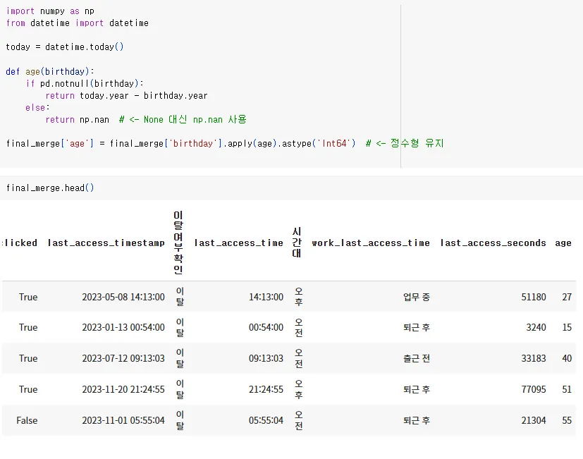 age 파생 컬럼으로 만들어 나이 구한 다음 > 이상치 처리로 삭제