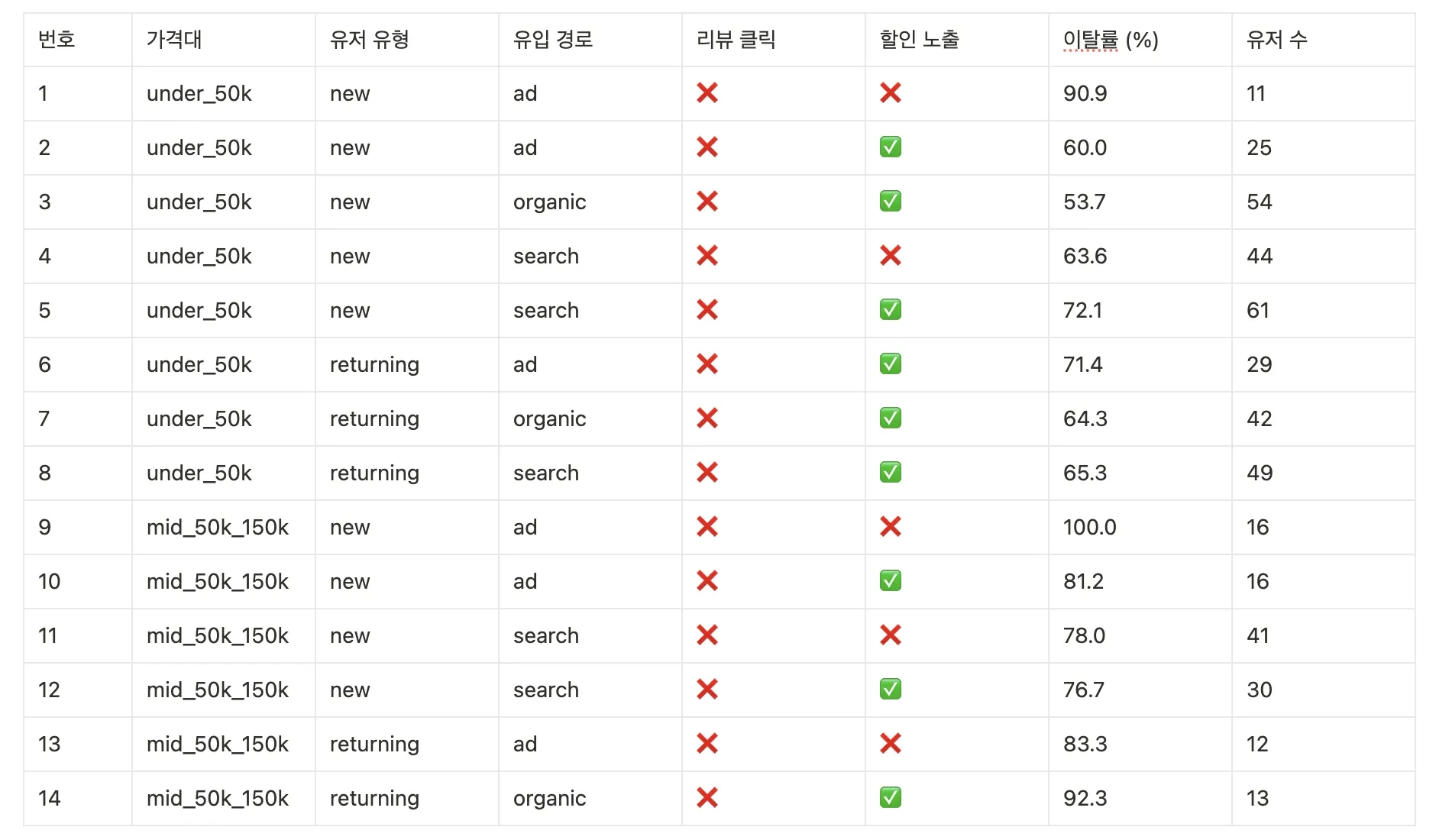 리뷰를 안 본 상황에서도 할인 하나만으로 이탈률이 30% 이상 낮아졌다. 광고 유입 신규 유저에게는 최소한의 혜택만 제공해도 전환 효과가 있다.
