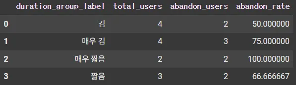 result['abandon_rate'] = result['abandon_users'] / result['total_users'] * 100