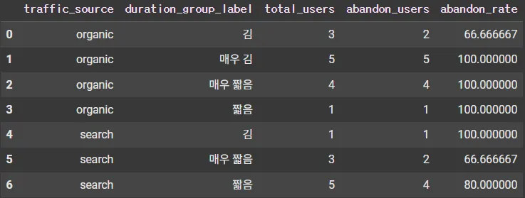 반대로 organic 유입은 long(60초) 에서 이탈률이 제일 낮아서 어느정도 확인 후 장바구니에 넣는다는 걸 확인할 수 있음