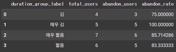 result['abandon_rate'] = result['abandon_users'] / result['total_users'] * 100