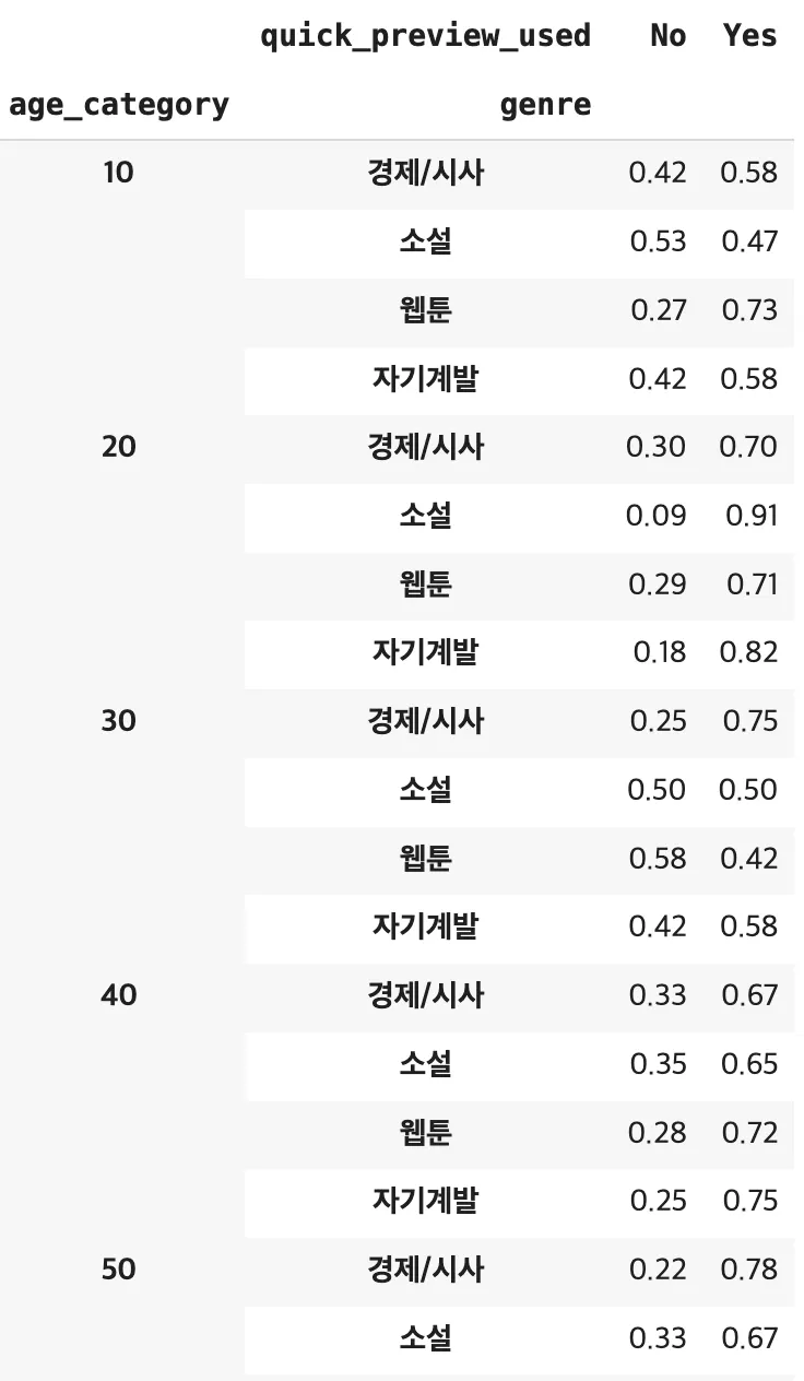 30대 : 경제/시사나 자기계발에서 미리보기 비중이 더 높으나, 소설이나 웹툰은 반반이거나 안 누르는 편