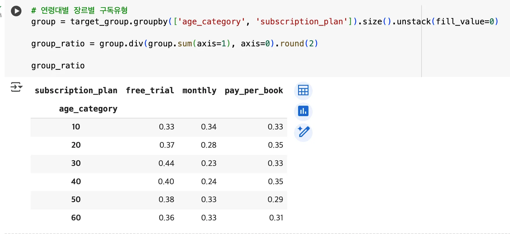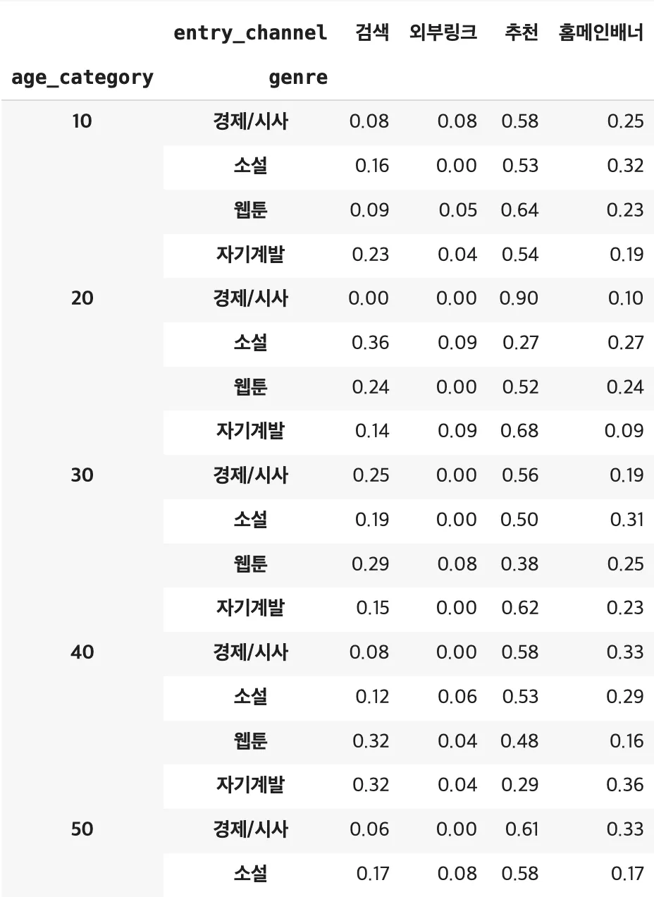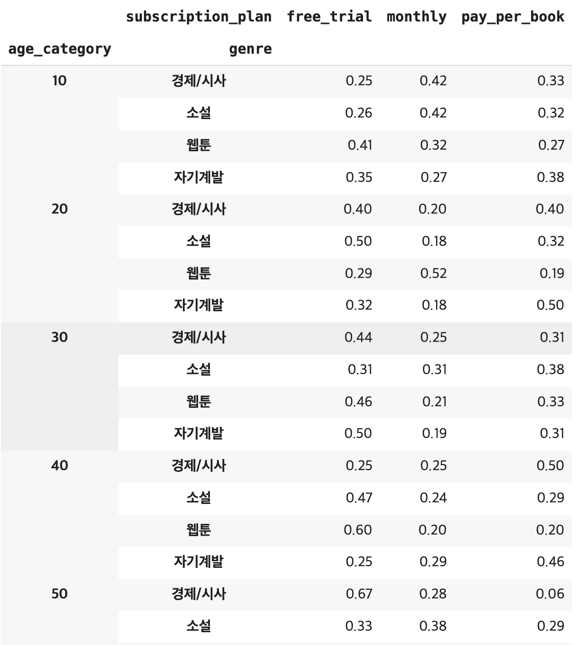 20대 : 경제/시사는 무료체험과 단권구매, 소설은 무료체험, 웹툰은 월간 구독, 자기계발은 단권 구매가 높은 편
