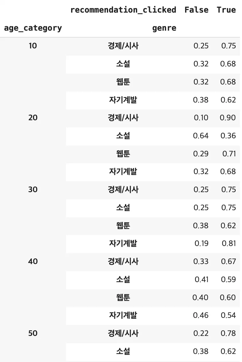→ 추천을 통해 유입된 20대의 미리보기 클릭률 :
