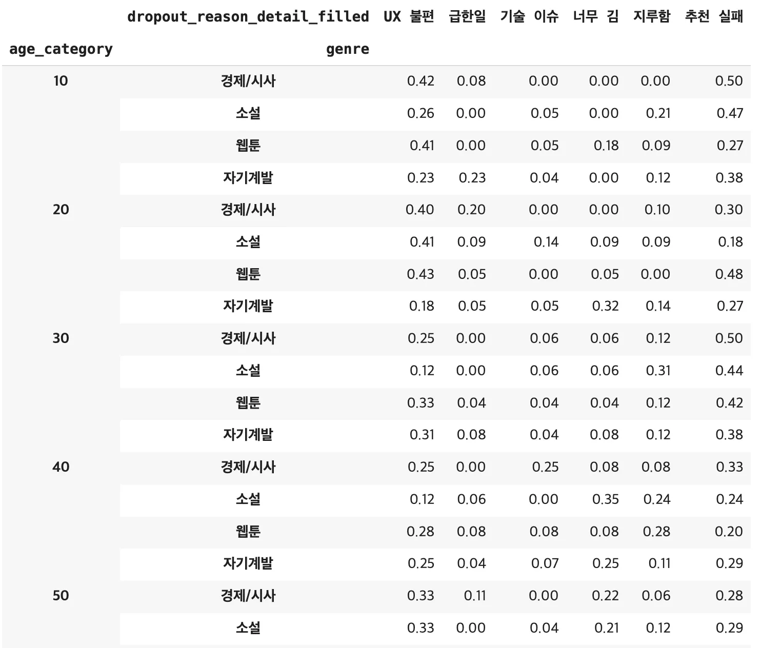 20대 : 경제/시사 & 소설은 UX 불편, 웹툰은 추천 실패, 자기계발은 너무 김이 주요 원인