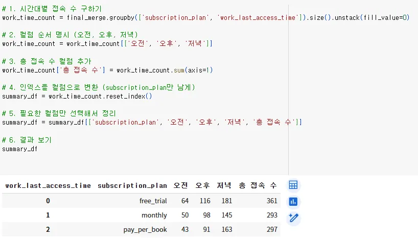 1 구독 플랜에 따른 시간대별 이탈 시점 분석 → 저녁에 가장 많은 유저들이 책을 읽다 이탈함