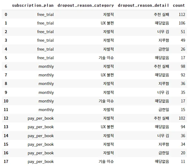 자발적으로 이탈한 사람이 가장 많은데, 모든 구독 플랜의 유저들이 동등하게 추천에 실패했다는 이유로 가장 많은 인원이 이탈