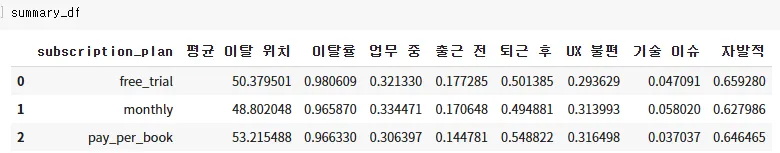 구독 플랜 별 평균 이탈시점, 이탈률, 마지막 접속 시간
