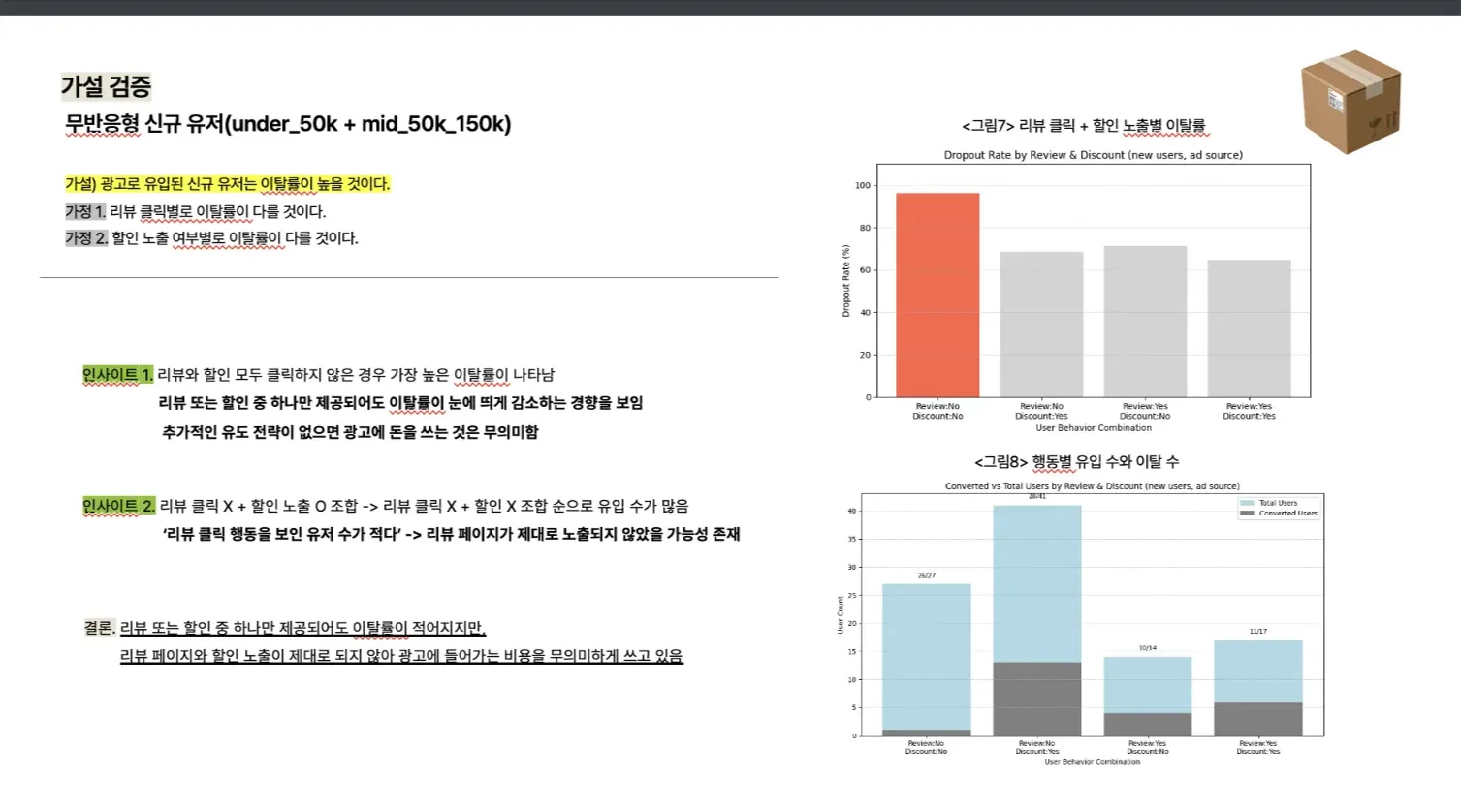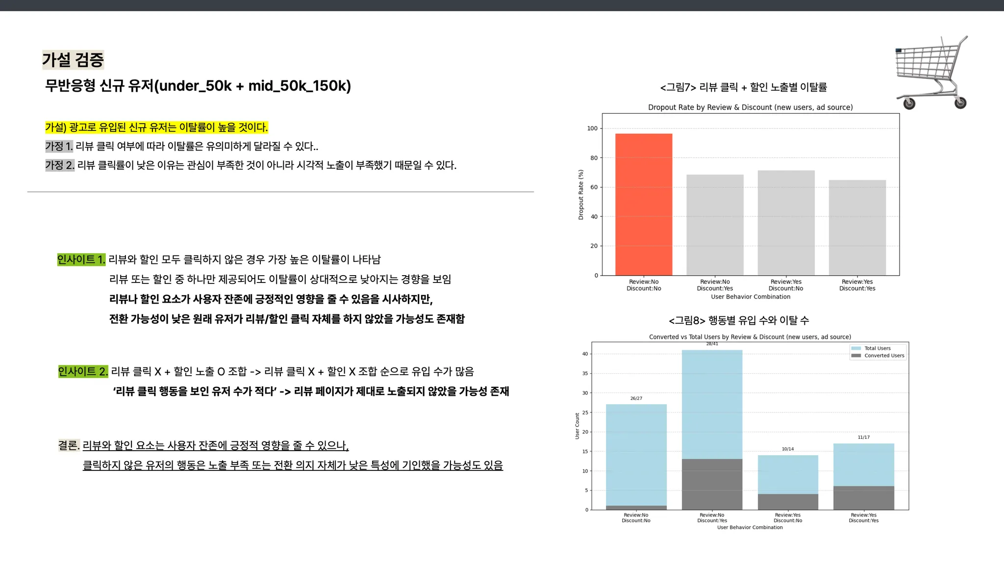 '리뷰와 할인 모두 클릭하지 않은 유저군에서 가장 높은 이탈률'이 관측되었지만, 이는 단순히 리뷰/할인이 없어서라기보다는 애초에 전환 가능성이 낮은 유저들이 클릭 자체를 하지 않았을 가능성도 존재할 수 있음