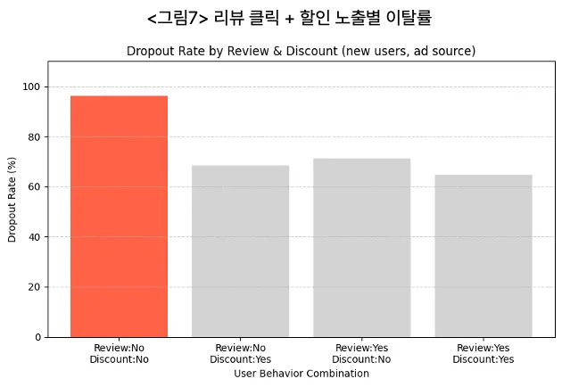 리뷰 또는 할인 중 하나만 제공되어도 이탈률이 눈에 띄게 감소하는 경향을 보임