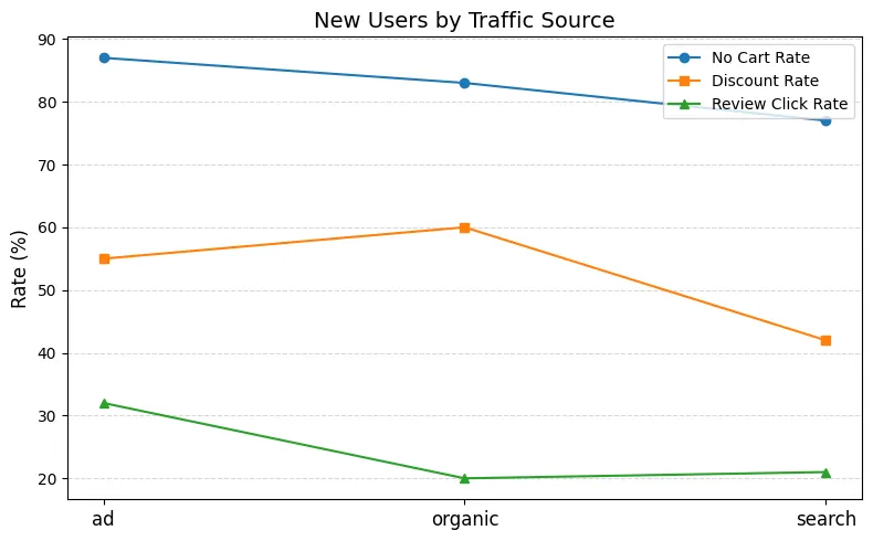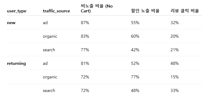 # 3. traffic_source๋ณ, review_clicked๋ณ ์ฌ์ฉ์ ์ ์ง๊ณ