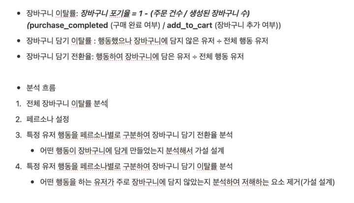 장바구니 담기 이탈률 : 행동했으나 장바구니에 담지 않은 유저 ÷ 전체 행동 유저