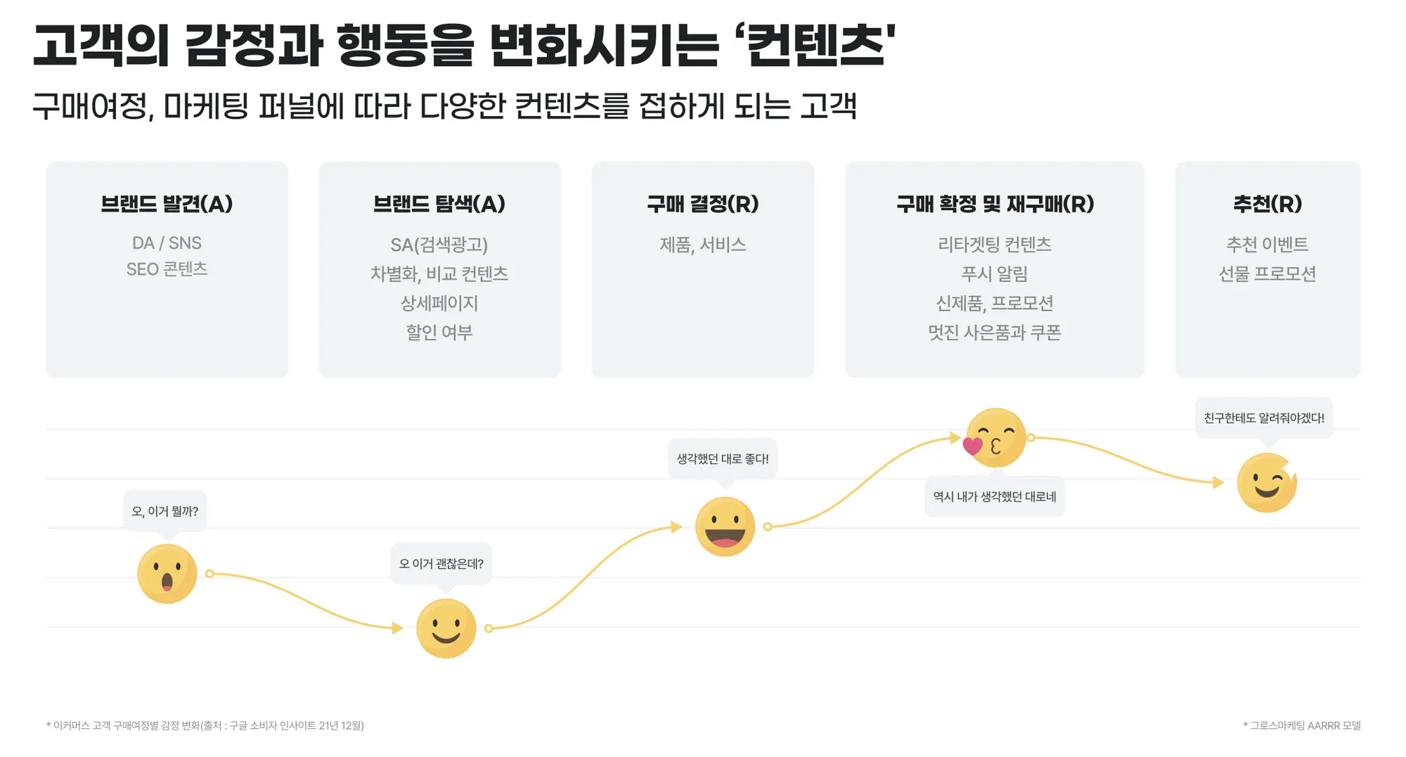 ARRR 프레임워크는 획득(Acquisition) → 활성화(Activation) → 재구매(Retention) → 매출(Revenue) → 추천(Referral)의 순서를 따르지만 이커머스에 있어서는 브랜드 발견 → 브랜드 탐색 → 구매 결정 → 구매 확정 및 재구매 → 추천으로 생각하는 것이 더 현실적일 것이다.