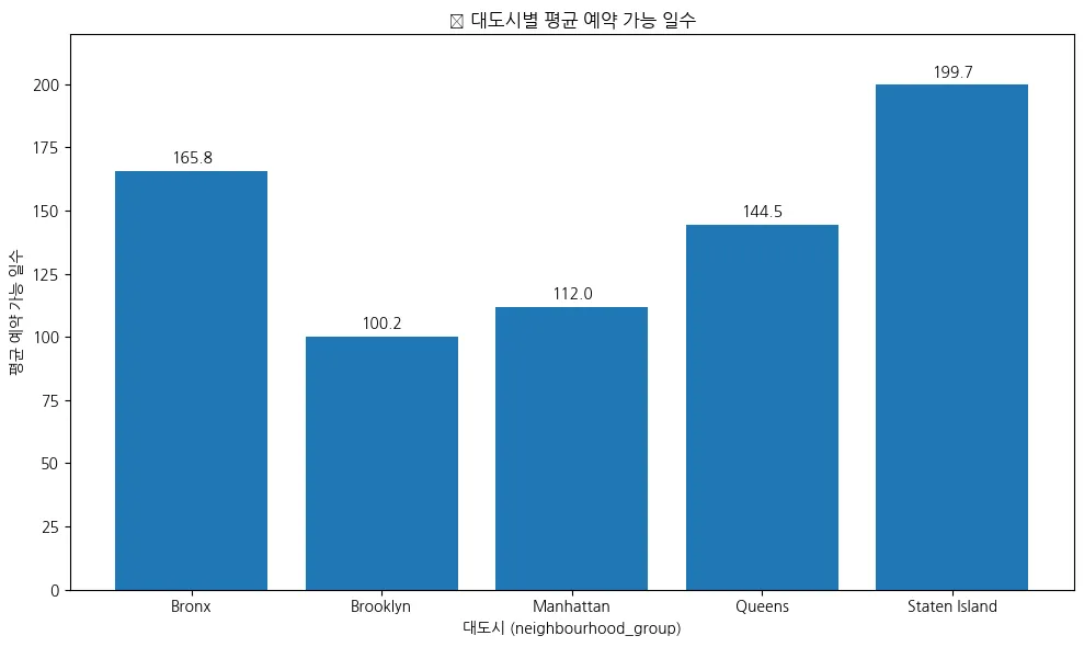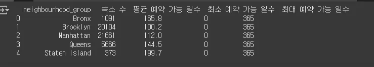 availability_stats.columns = ['neighbourhood_group', '숙소 수', '평균 예약 가능 일수', '최소 예약 가능 일수', '최대 예약 가능 일수']