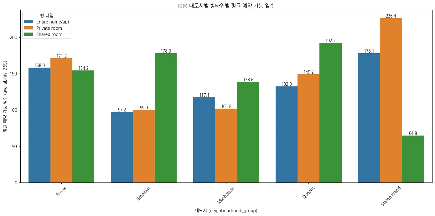 대도시 별 방 타입 별 예약 가능 날짜 수 통계 계산