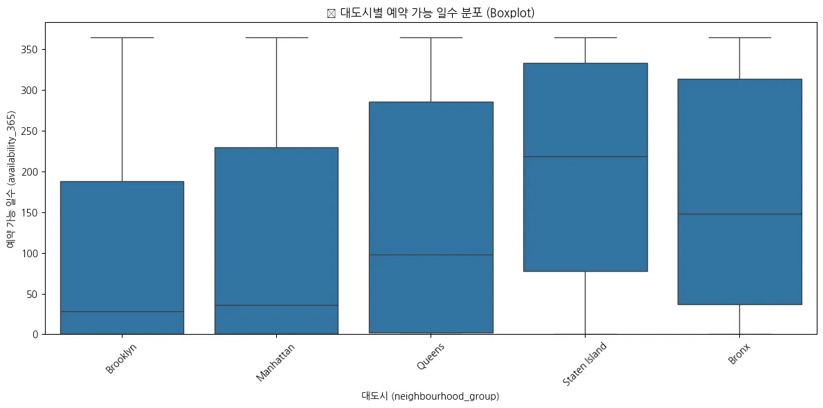 plt.title('📦 대도시별 예약 가능 일수 분포 (Boxplot)')