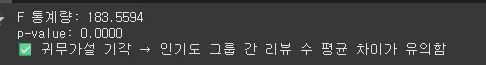 print("❌ 귀무가설 채택 → 인기도 그룹 간 리뷰 수 평균 차이가 유의하지 않음")