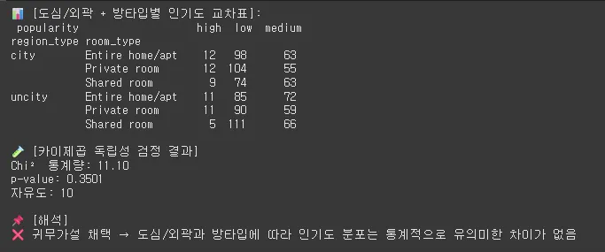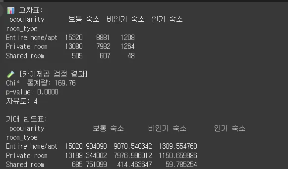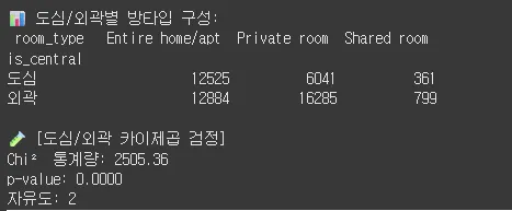 귀무가설 (H₀) | 도심/외곽과 방타입은 인기도에 영향을 미치지 않는다 (독립적이다) |