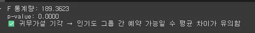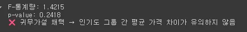 print("❌ 귀무가설 채택 → 인기도 그룹 간 평균 가격 차이가 유의하지 않음")