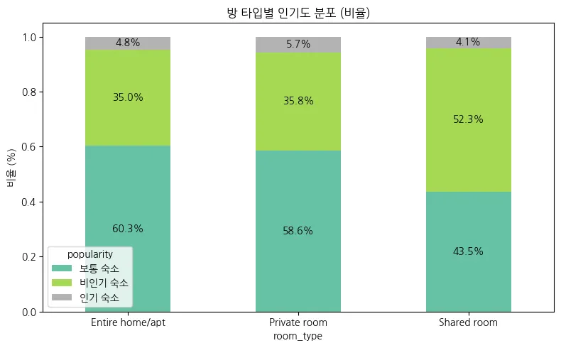 즉, 운영 위치보다 숙소의 타입과 운영 상태(리뷰 수, 가용일수 등)가 인기도에 더 영향을 미친다고 해석 가능.