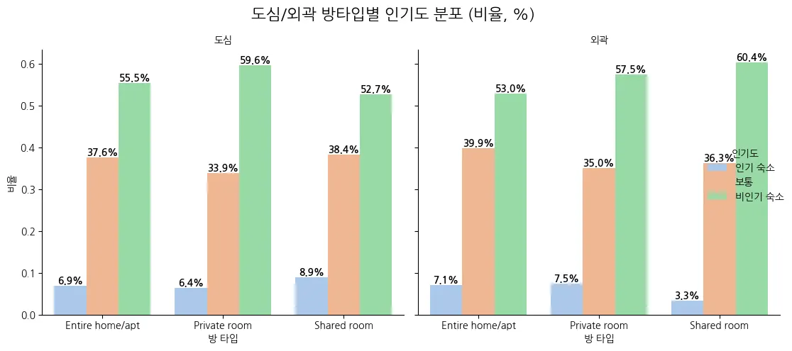 도심 vs 외곽 간 각 방 타입에서의 인기 숙소 비율 차이는 크지 않음.