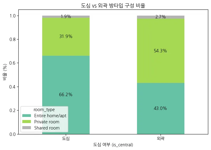 세부 분석: 도심 vs 외곽에 따라 방 타입 인기도가 다를 것이다