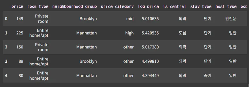 'log_price', 'is_central', 'stay_type', 'host_type', 'popularity']].head()