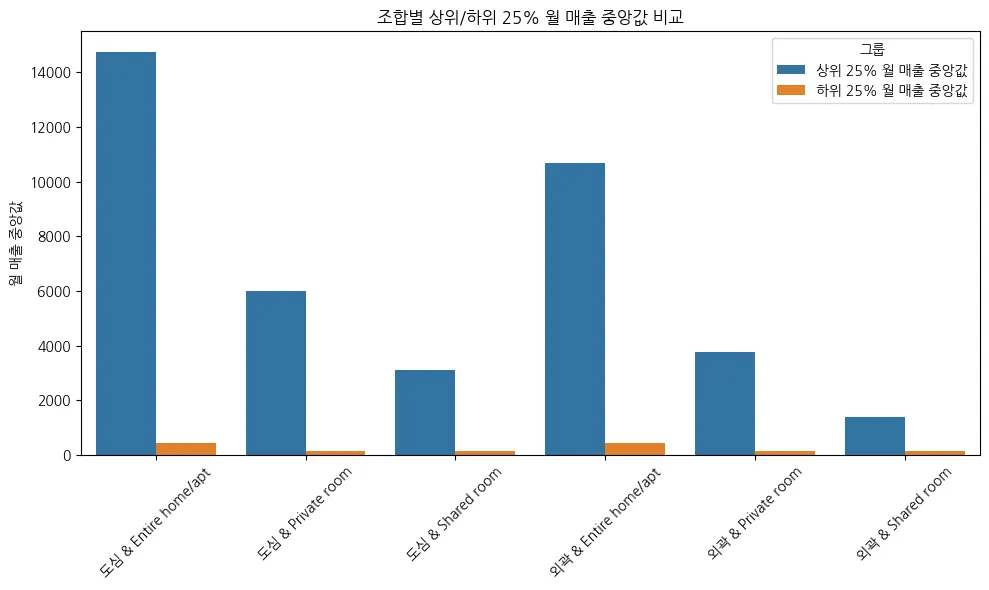 plt.title('조합별 상위/하위 25% 월 매출 중앙값 비교')