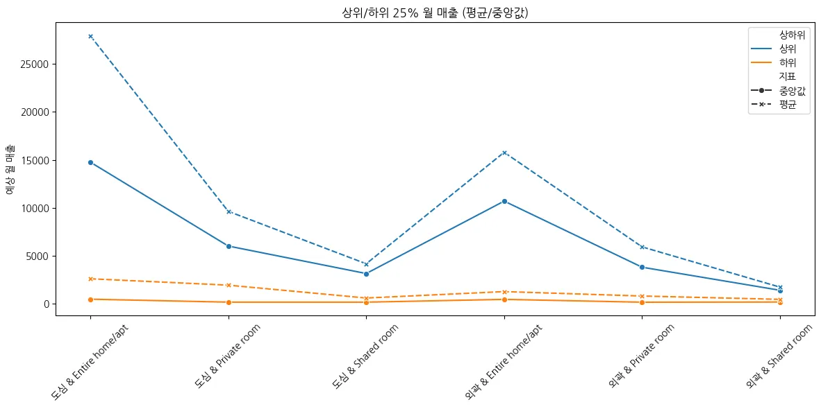 상위 25% 숙소(우수 숙소)의 월 예상 매출과 하위 25% 숙소(비우수 숙소)의 월 예상 매출은 같다.