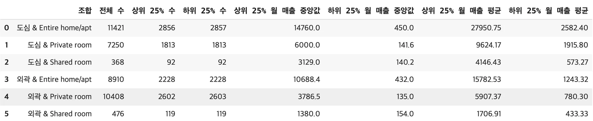 # 각 조합별로 상/하위 25%에서 단기/중기/장기 숙소 수 세기