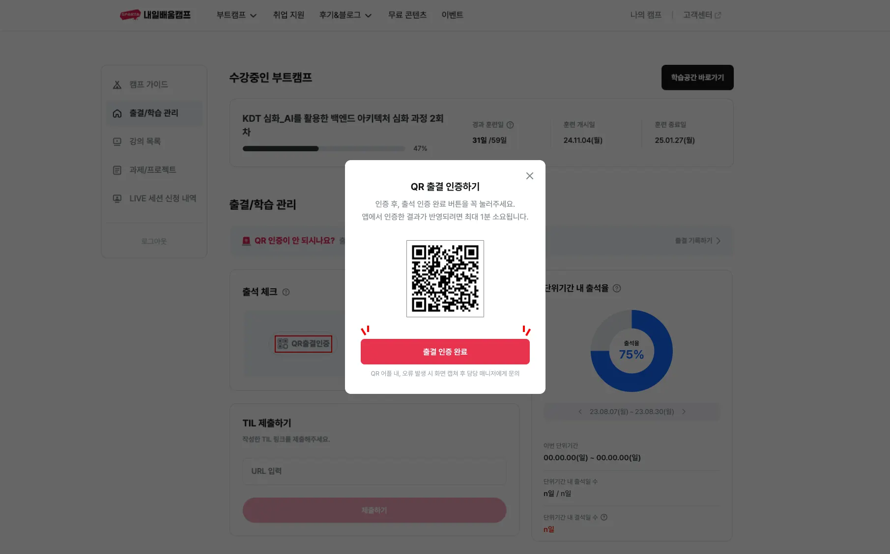 출결 관리 페이지 접속 : https://nbcamp.spartacodingclub.kr/mypage/attendance/qr