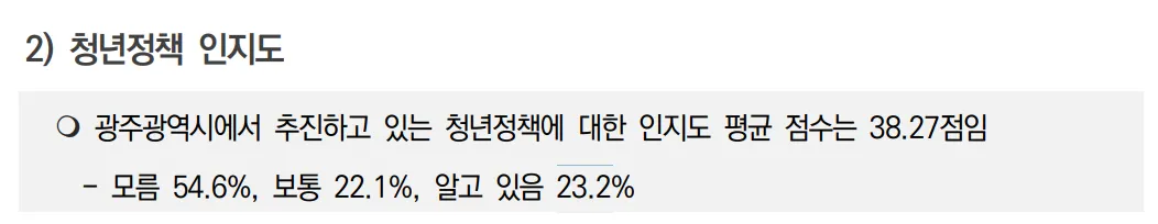 광주 청년 최우선 고민은 취업/일자리(46.6%)이며 정책 인지도는 낮고(23.2%) 절반 이상이 정책을 잘 모름(64.5%)