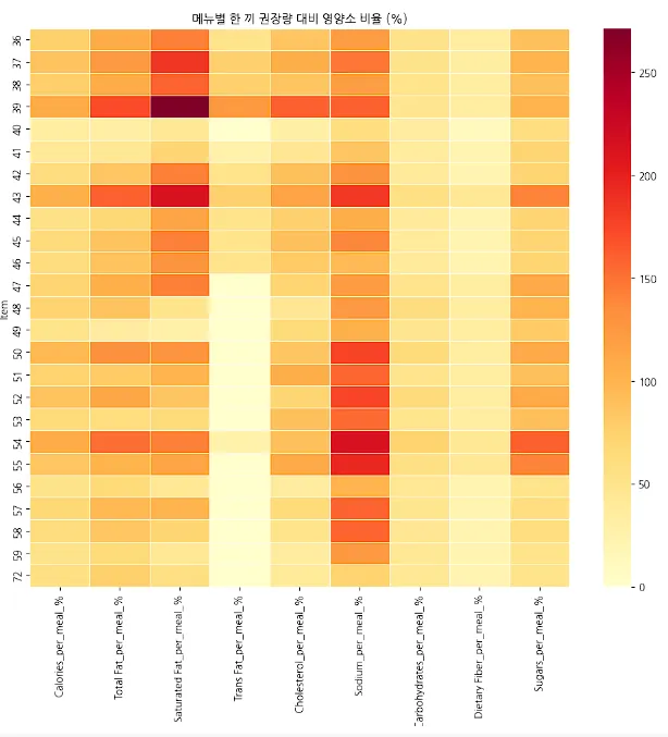 한끼 권장량 대비 비율을 보았을때, 나트륨양은 한끼 권장량보다 평균 135.1% 높았다.