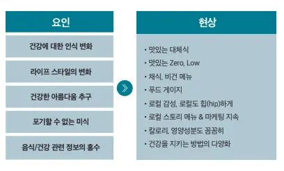 지속가능성 : 저칼로리 등 다양한 옵션이 현대 외식산업의 주요 흐름으로 자리 잡고 있다.